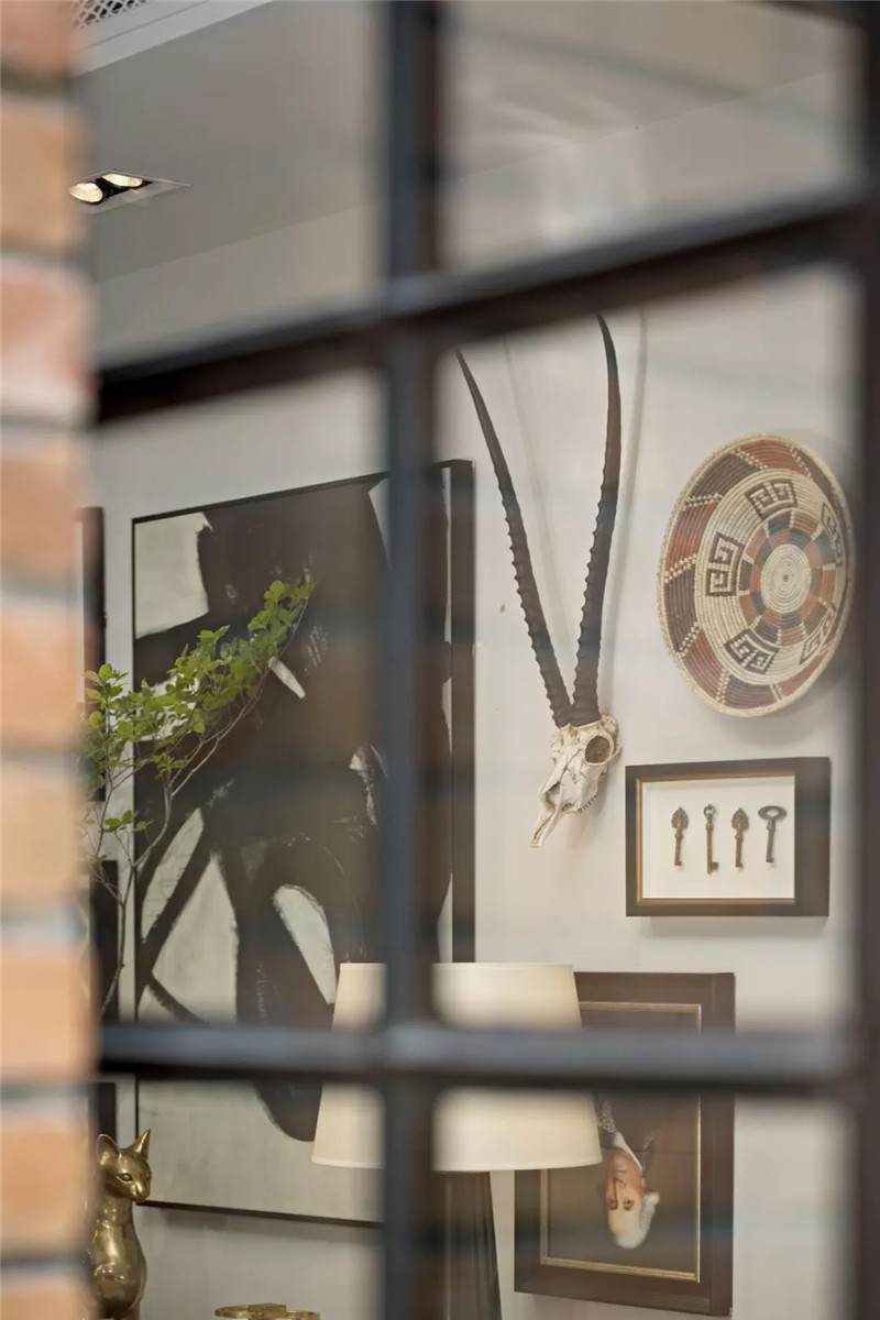 起居室背景展示墻,以混搭風(fēng)格鋪陳出洛普普的敘事展現(xiàn)。原始的羚羊頭飾,彷若征服野性蠻荒,象征勝利光輝。鑰匙是正在延續(xù)著的權(quán)勢標(biāo)志。設(shè)計師用跳色的編織盤與抽象藝術(shù)畫將微量的彩色疊加進(jìn)黑白灰的間隙中,呈現(xiàn)出別樣、細(xì)膩的風(fēng)情。而左下角的守護(hù)貓,一如埃及傳說中神秘的幸運(yùn)守護(hù)者,正看顧著明亮通透的窗外,不斷朝曦夕映的美好時光。