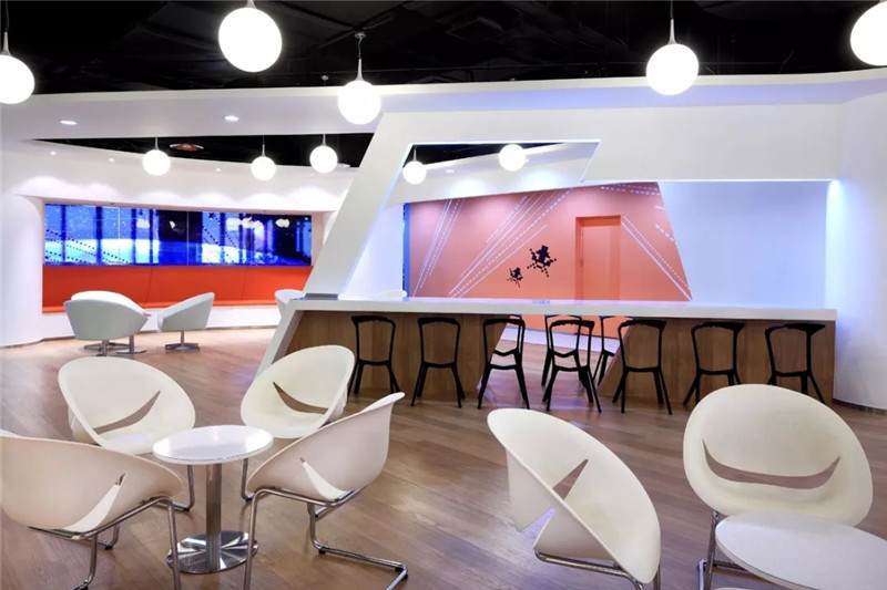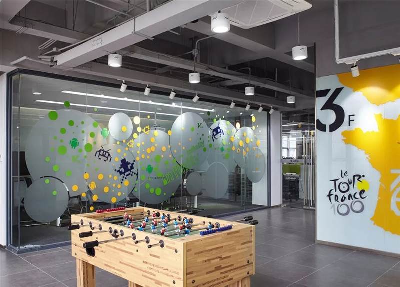 第二張中可以看到,桌上足球,這一張是會議室的玻璃貼膜,最初設計的都是一些彩色的圓點,但是做完后太通透,起不到遮擋作用,所以現(xiàn)場臨時在玻璃的內側又加了大型的磨砂圓,就有兩層疊加到一起的圖形,磨砂與色彩組合在一起,效果豐富有層次。