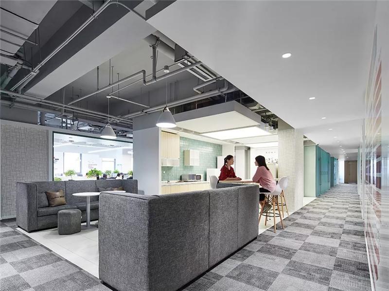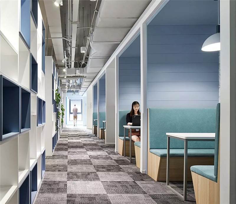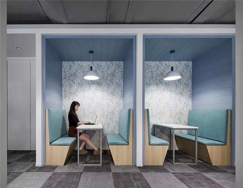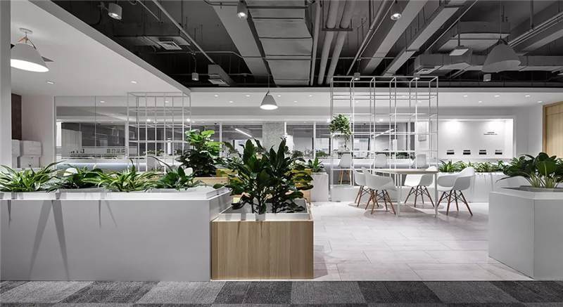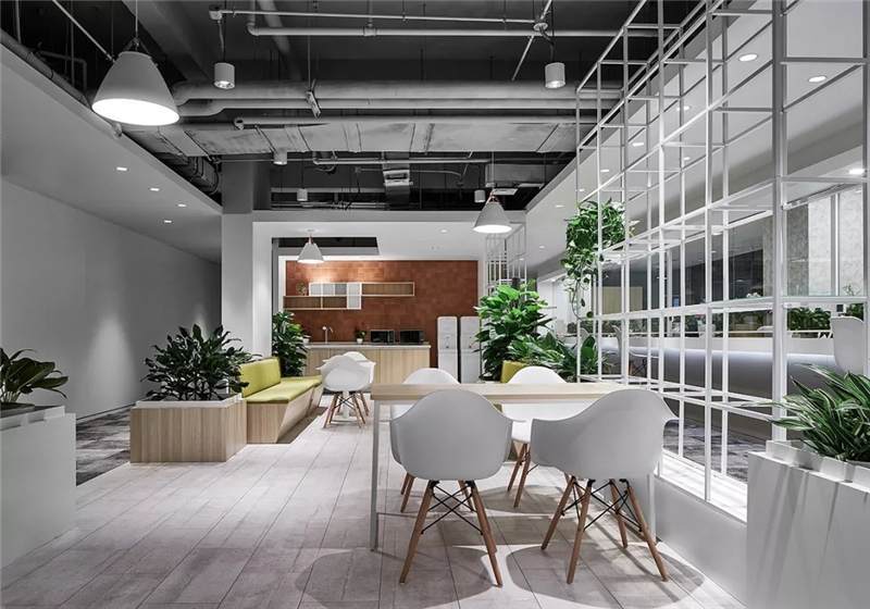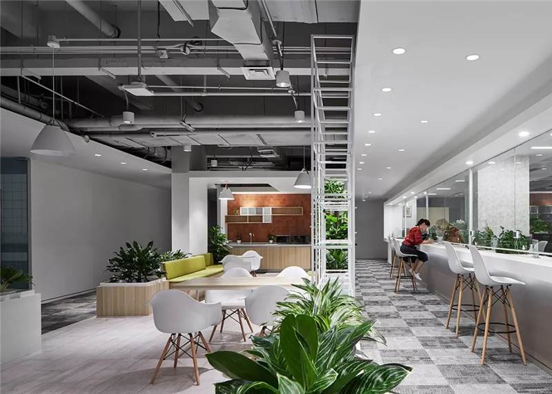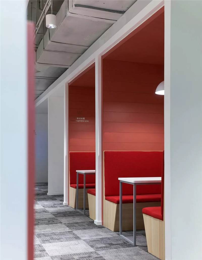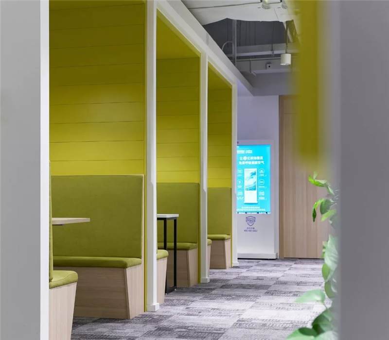 3-6層的各事業(yè)部及旗下子公司辦公層,設(shè)計師沿著核心筒打造環(huán)形的公共區(qū)域及溝通環(huán)廊帶,依次布置開放休憩洽談區(qū),電話亭,小型會議室,茶水間,衛(wèi)生間,涂鴉板等促進(jìn)溝通交流但界限模糊的混合功能區(qū),并采用卡座,綠植,通透金屬框架,玻璃配以貼膜,墻貼等方式營造公共區(qū)域與辦公區(qū)之間的多層次關(guān)系,形成自由穿梭的辦公空間動線。
