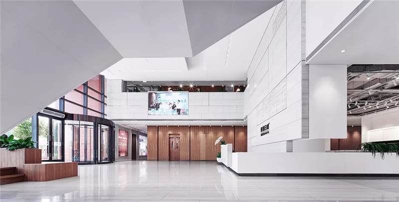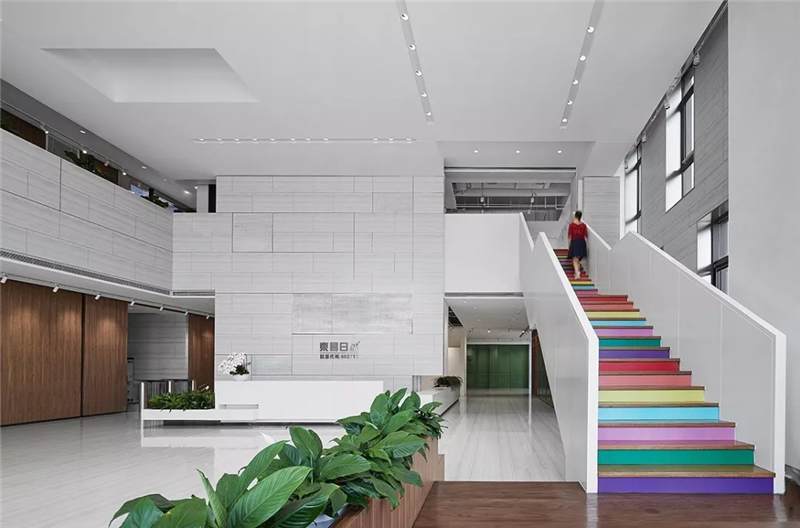 前廳大堂采用高挑空結(jié)構(gòu),用大尺寸純色人造石雕刻工藝打造前臺及LOGO背景墻,背景墻后設(shè)置墻體與東易日盛高端家裝高科技產(chǎn)品一體化展示區(qū),右側(cè)設(shè)置白色穿孔鋁板樓梯配以彩色階梯直達(dá)二層展廳,樓梯平臺以木飾面板點綴綠植打造成休憩待客區(qū),整個大堂接待區(qū)營造出現(xiàn)代,開放,包容的氛圍。
