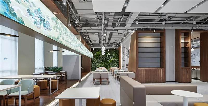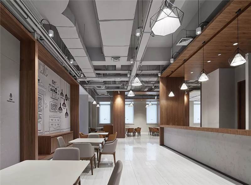 前廳左側(cè)穿越企業(yè)榮譽(yù)展示墻即是咖啡廳和用餐區(qū)??举|(zhì)家具圍合成不同的半私密性空間,黑色幾何線條吊燈及長條形中國傳統(tǒng)園林山水飾面燈箱分別營造出現(xiàn)代與古典相融的用餐氛圍。