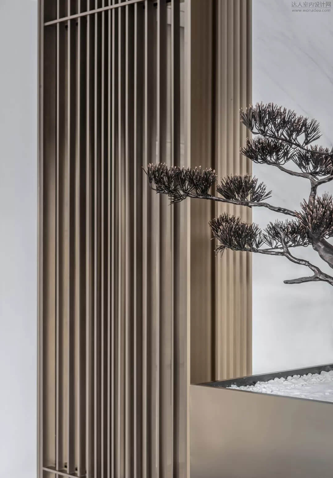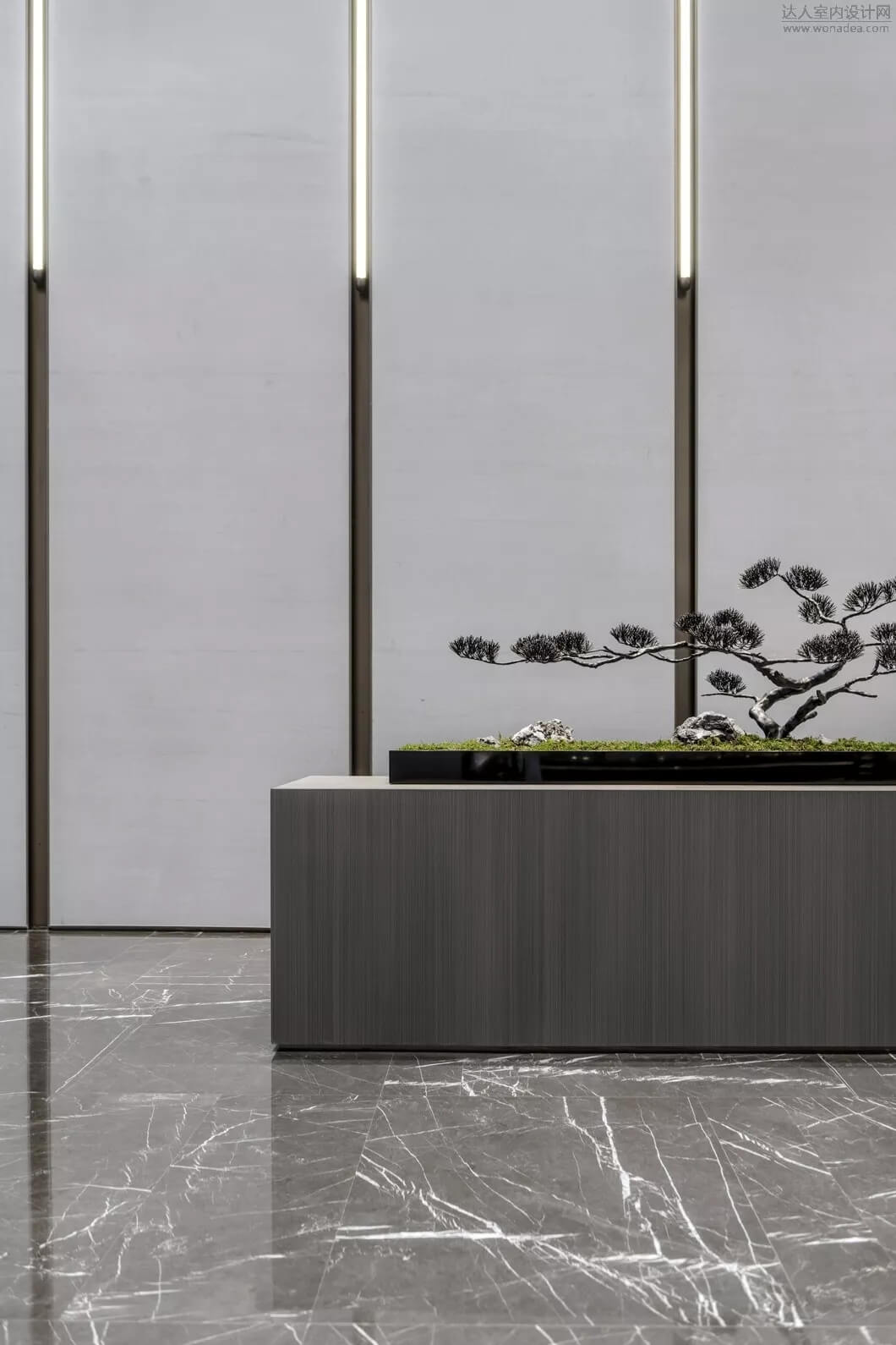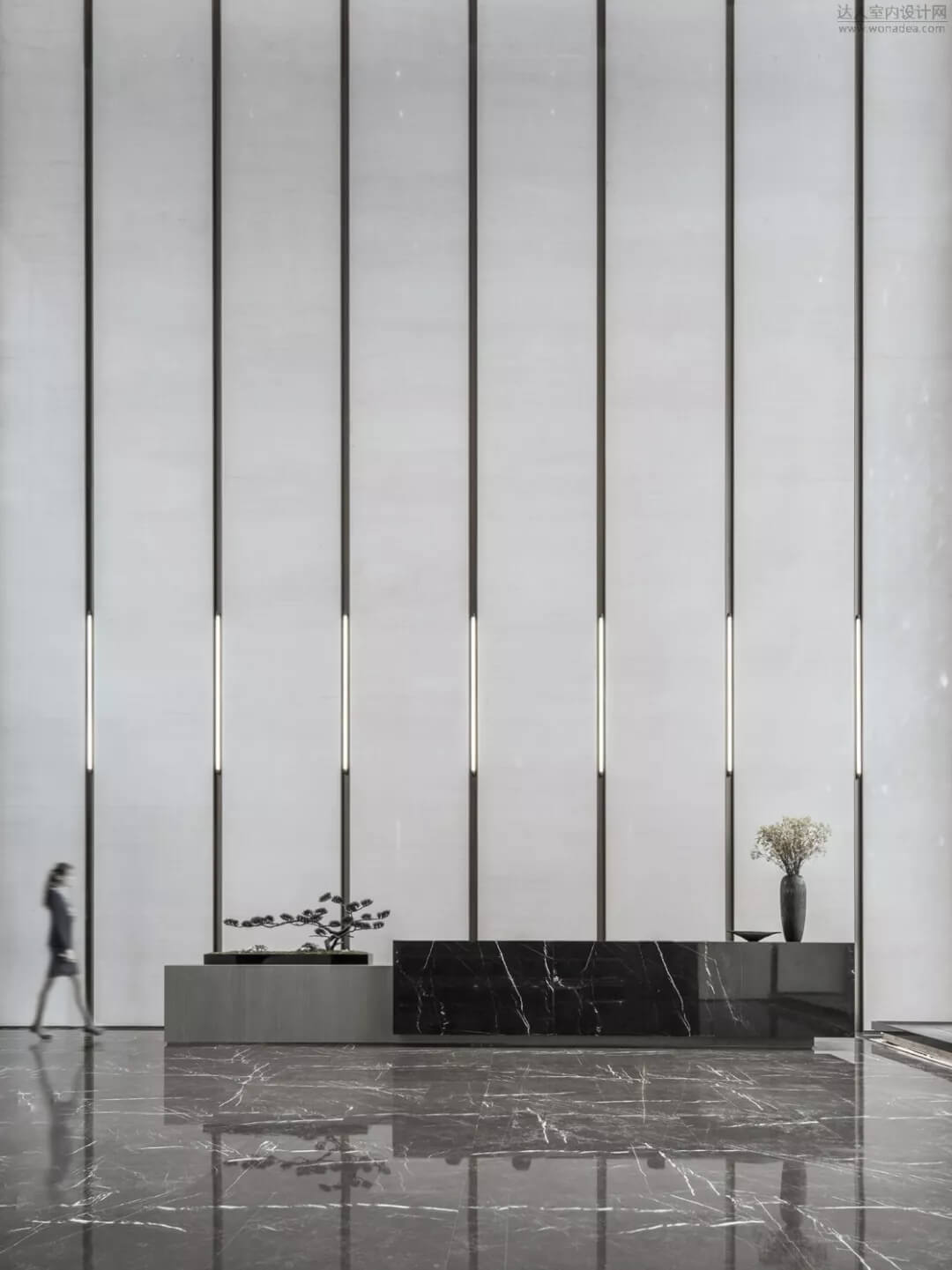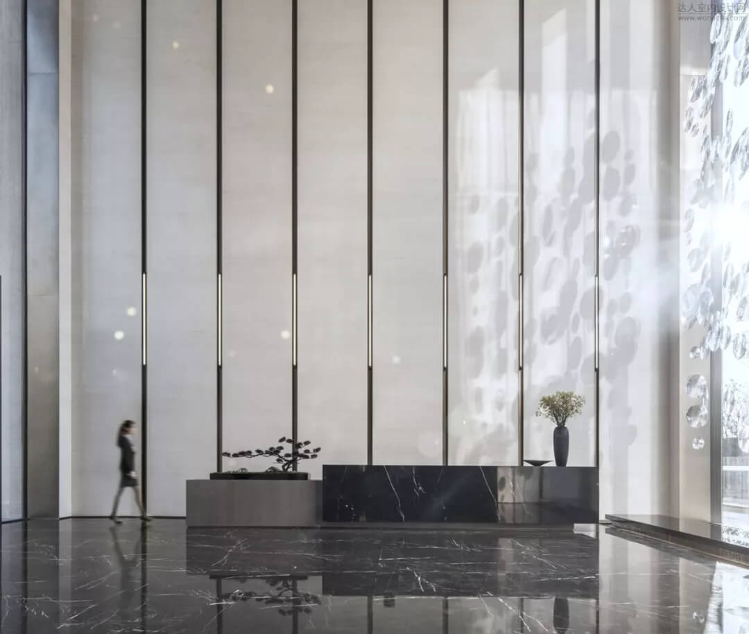 通過豐富的景觀區(qū)進入門廳,感受到空間的空靈,立面設(shè)計過濾了來自于外界的繁復。十米挑空的大廳,墻面以米色砂巖為基底,黃銅色金屬強化縱向的比例,凸顯出空間的氣勢。入口對景設(shè)置的水景讓穿梭其中的訪客仿若能傾聽到潺潺水聲,同時水景和懸掛的軟裝裝置相得益彰,充滿巧妙的用意,同時也分隔了挑高通透的玻璃幕墻,虛實結(jié)合,體現(xiàn)現(xiàn)代設(shè)計的東方神韻。