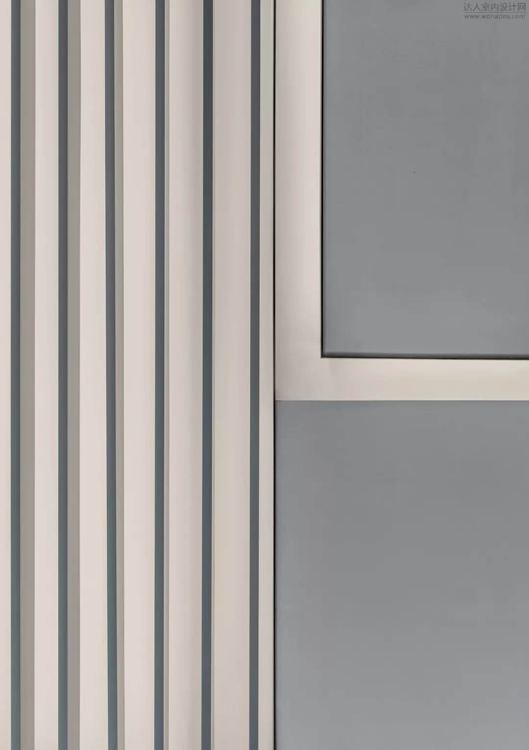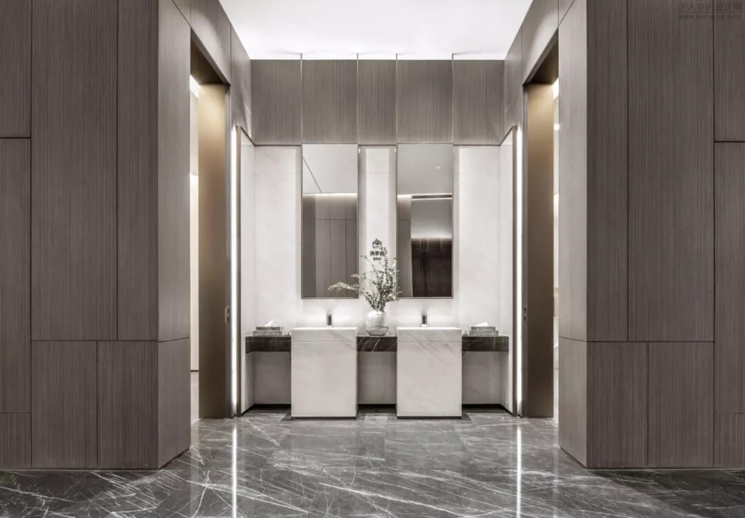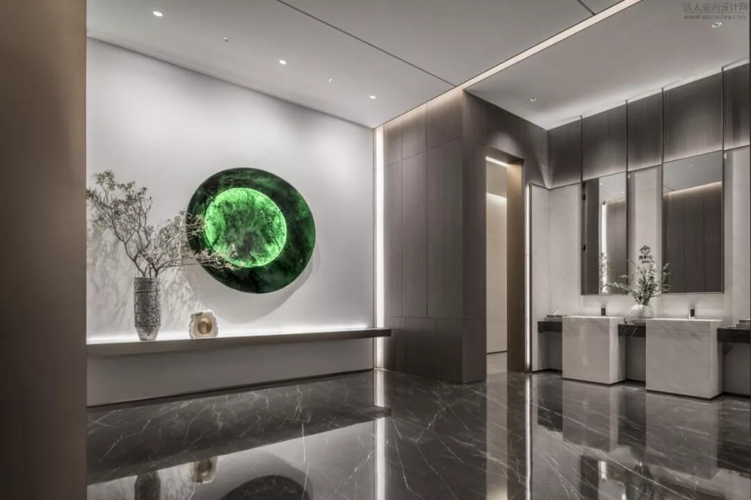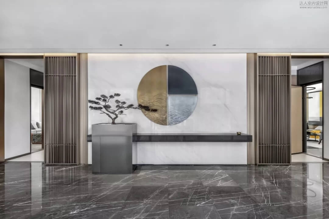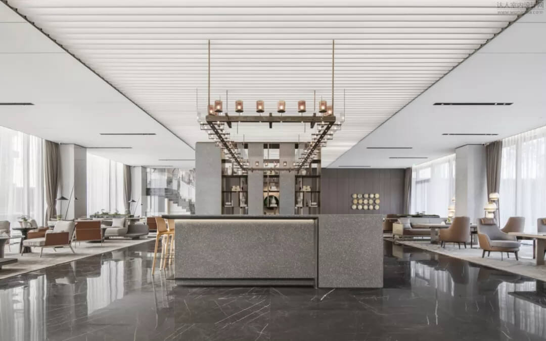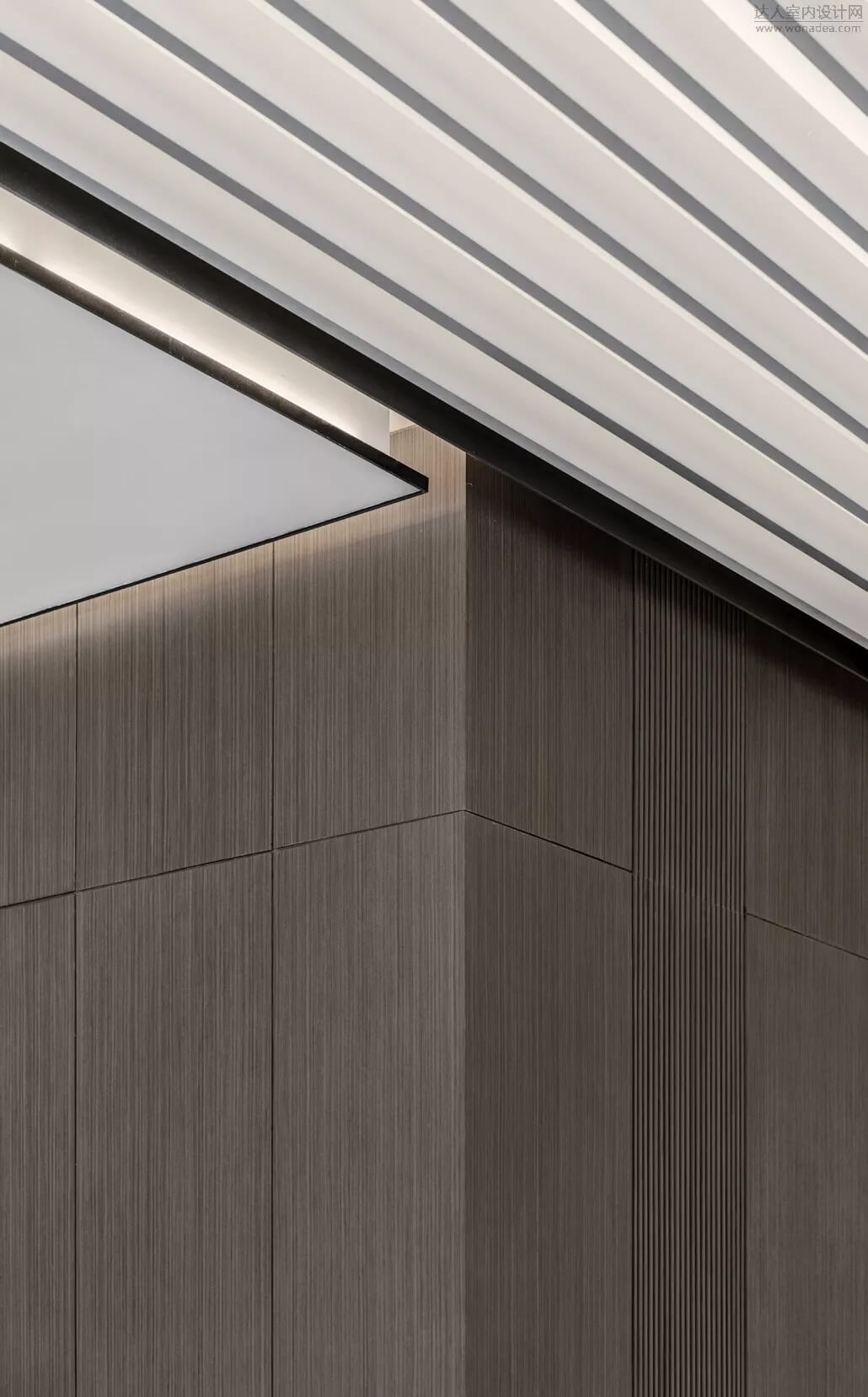 通過豐富的景觀區(qū)進入門廳,感受到空間的空靈,立面設(shè)計過濾了來自于外界的繁復。十米挑空的大廳,墻面以米色砂巖為基底,黃銅色金屬強化縱向的比例,凸顯出空間的氣勢。入口對景設(shè)置的水景讓穿梭其中的訪客仿若能傾聽到潺潺水聲,同時水景和懸掛的軟裝裝置相得益彰,充滿巧妙的用意,同時也分隔了挑高通透的玻璃幕墻,虛實結(jié)合,體現(xiàn)現(xiàn)代設(shè)計的東方神韻。