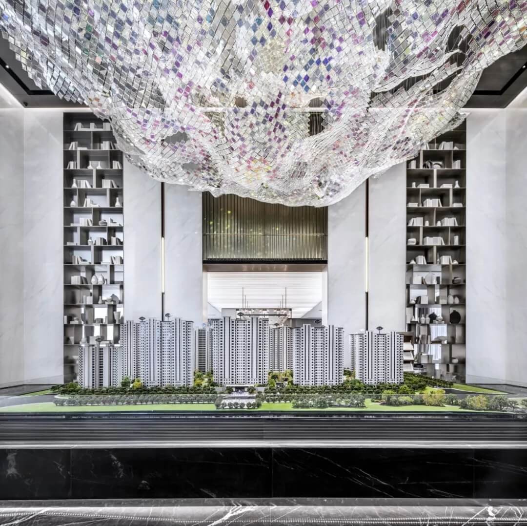 沙盤區(qū)墻面以大花白陶瓷板為主墻面,通過通高的黃銅書架體塊和金屬格柵,本身空間具有很強的中軸對稱的儀式感,凸顯出空間的大氣。曼妙的波浪曲線,以流動的韻律打破空間靜態(tài),同時從明亮空靈的大堂走入半圍合的沙盤區(qū),總能給人帶來新奇感,亦是詩意與藝術(shù)的格調(diào)升華。