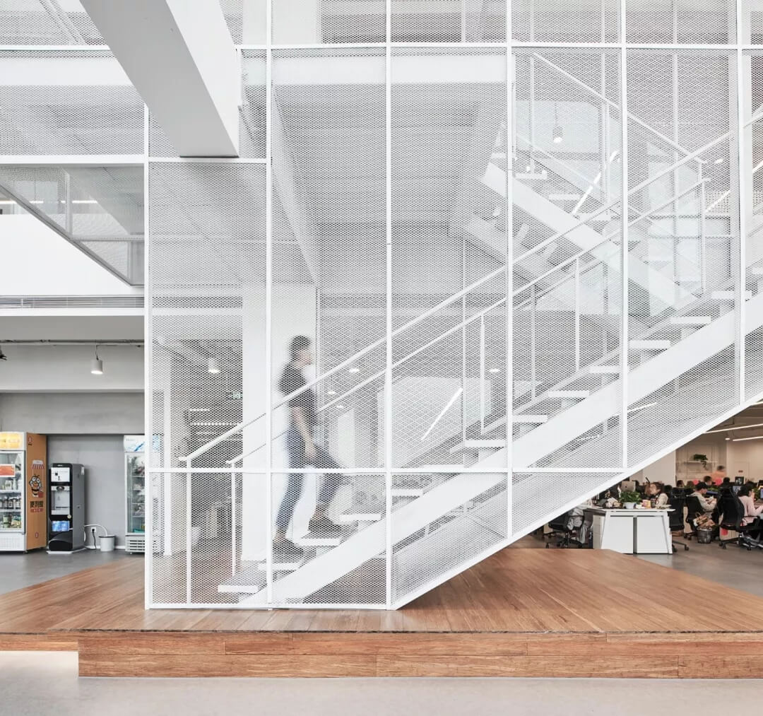 云端漫步主題島樓層公共空間設(shè)置了木質(zhì)的懸掛BOX,用白色的鋼網(wǎng)樓梯連接,樸素和輕盈通透形成鮮明的對(duì)比,如云端漫步,自然中蘊(yùn)含天馬行空,打開員工的創(chuàng)意想象。