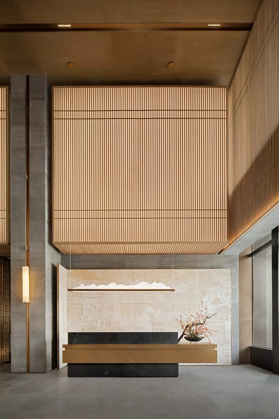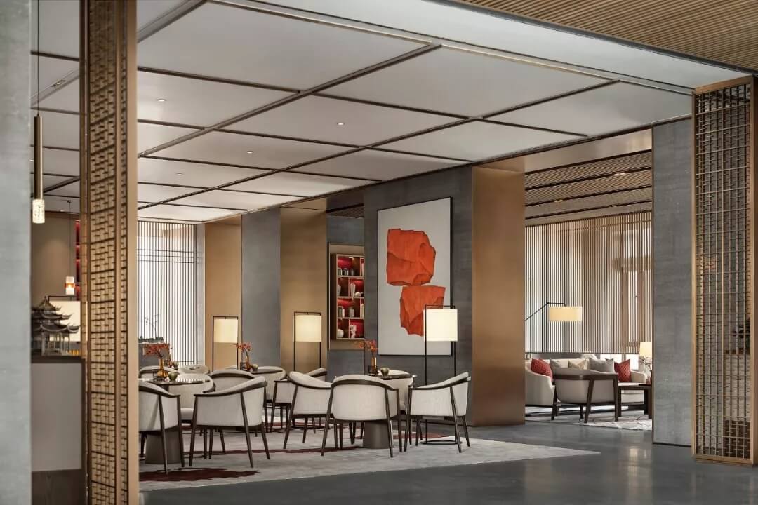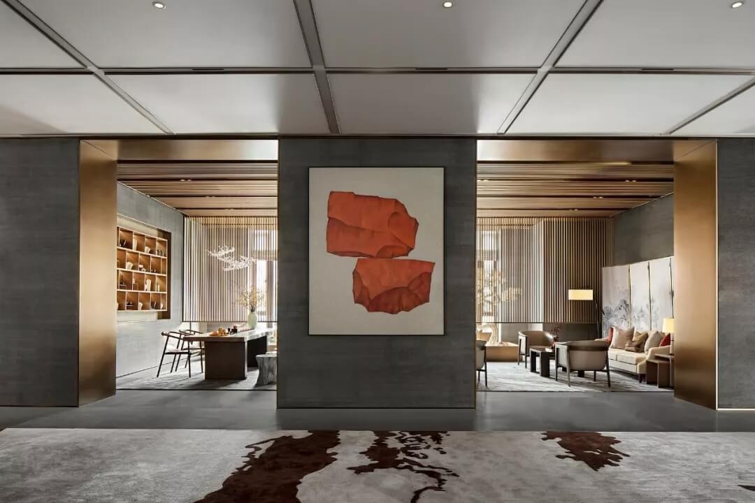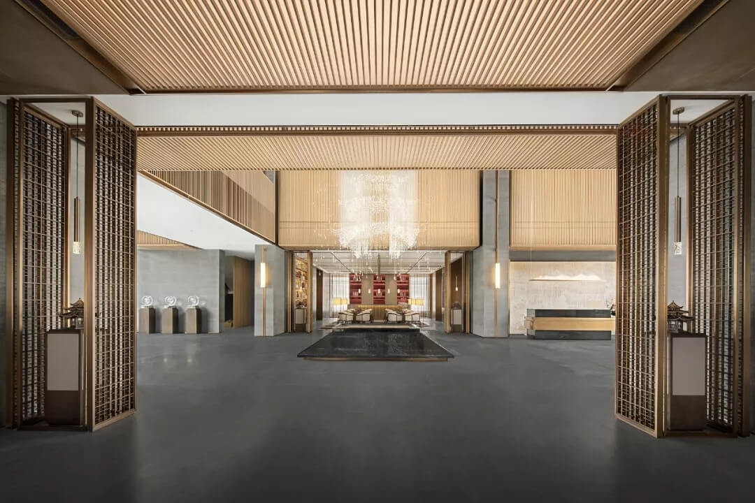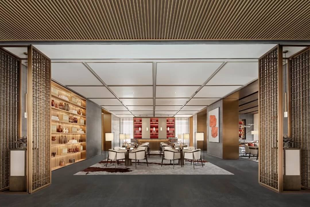 踏入第一重空間的迎賓前廳,大堂挑空高7.7米,氣勢恢宏。“甲第者以禮為官也,不學禮,無以立。”為此,迎賓區(qū)的設(shè)計干練簡潔,以飽含的禮儀序列拉開整個空間的序幕。