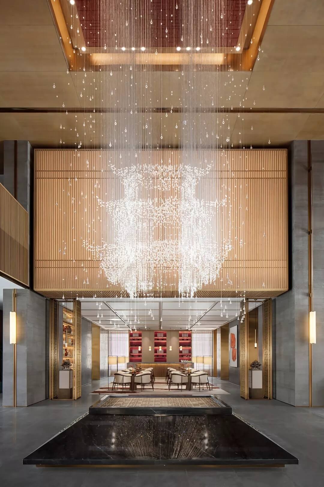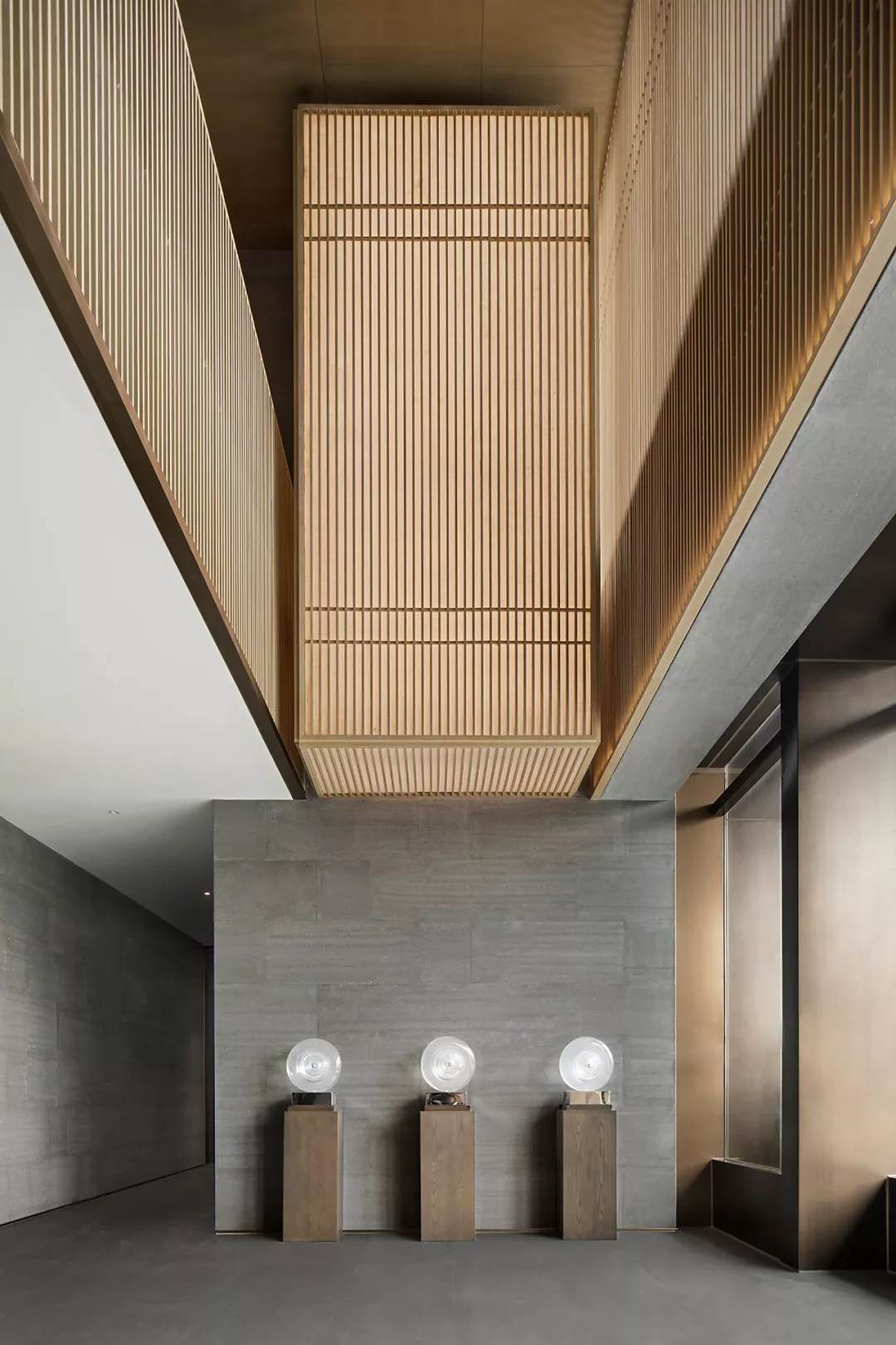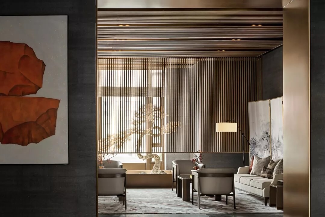 踏入第一重空間的迎賓前廳,大堂挑空高7.7米,氣勢恢宏。“甲第者以禮為官也,不學禮,無以立。”為此,迎賓區(qū)的設(shè)計干練簡潔,以飽含的禮儀序列拉開整個空間的序幕。