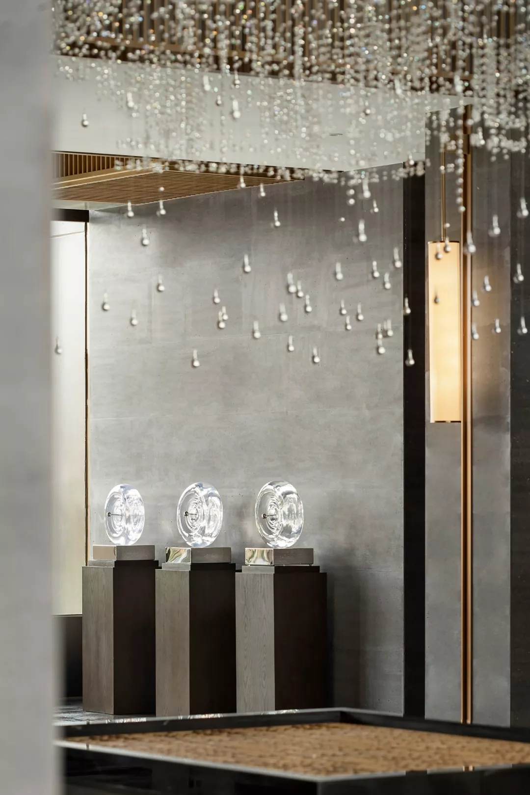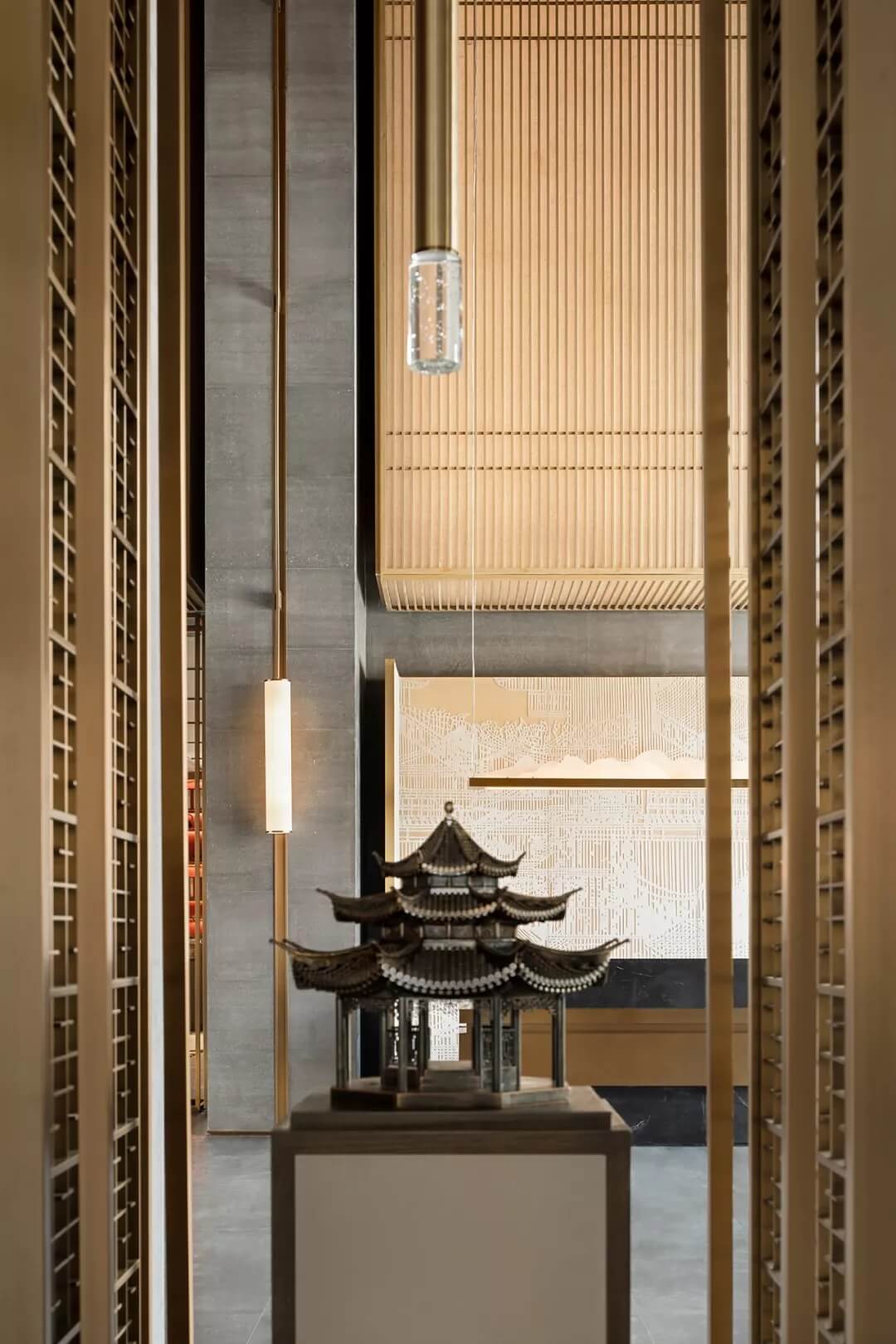 后廳兩端藝術(shù)裝置呈矩陣對稱分布,延續(xù)了古老東方的嚴肅審美。在材質(zhì)多元的形態(tài)下,又極具層次變化。