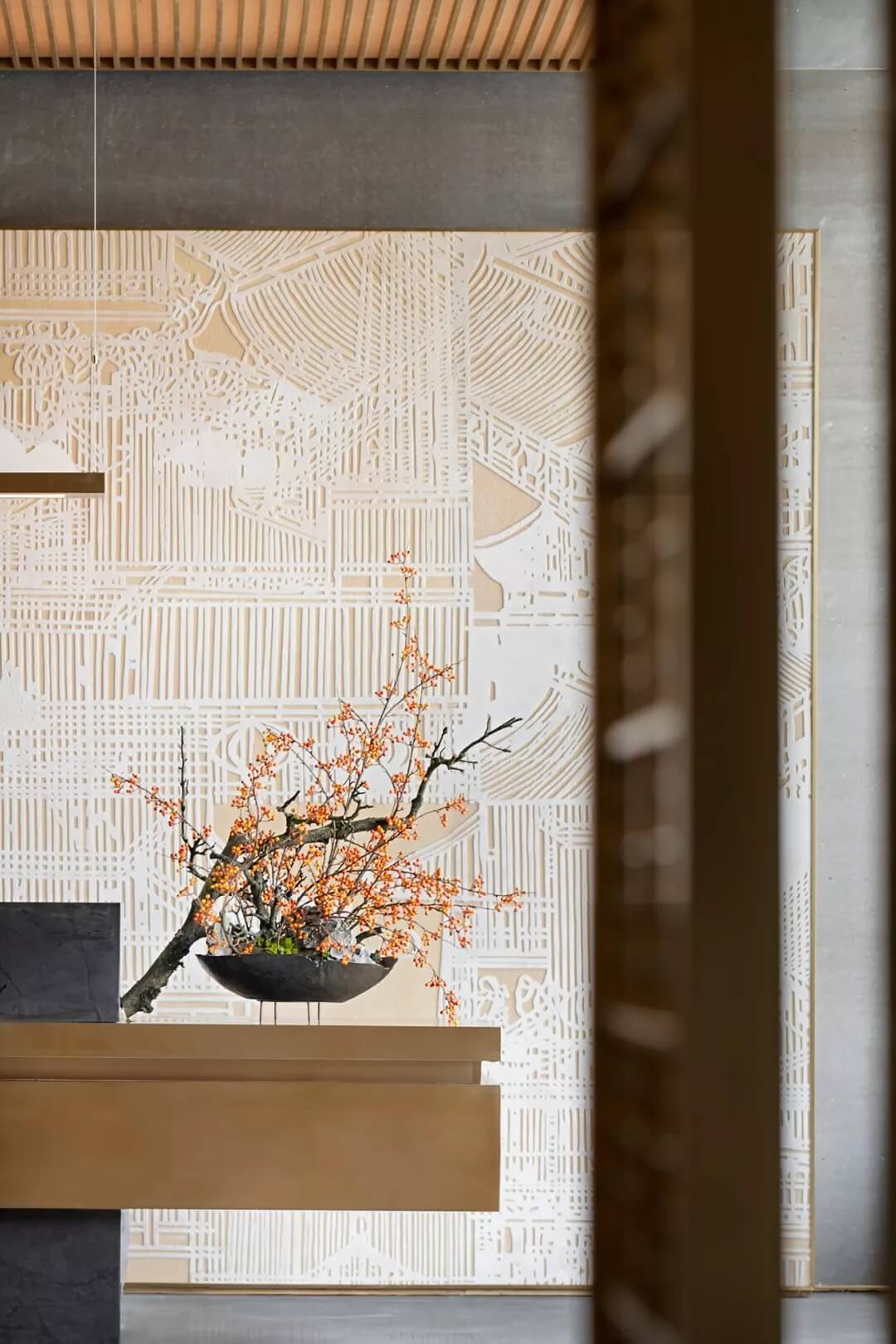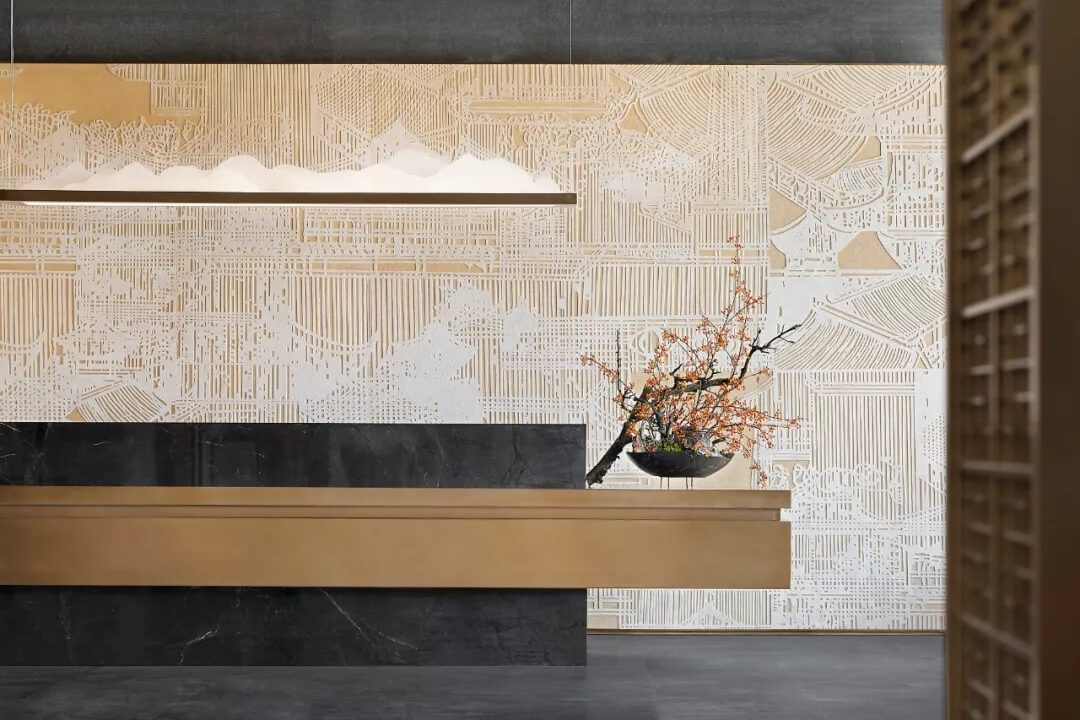 接待臺后方屏風采用香檳金木飾面打底,以浮雕般的技法將顏料手工涂抹之上,勾勒出亭臺樓閣、門坊巷院、宅第集群。臺面上的橘紅插花,講究枝葉的旁逸斜出,保留線條美與自然美,平添了一種沉靜之氣,將東方之意引入更悠遠的境地。