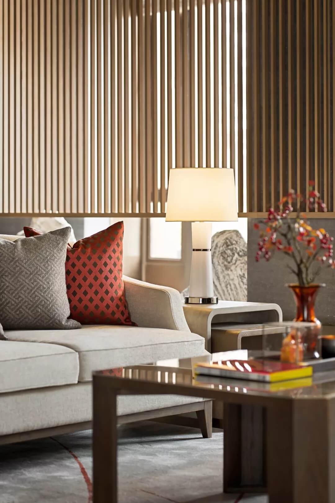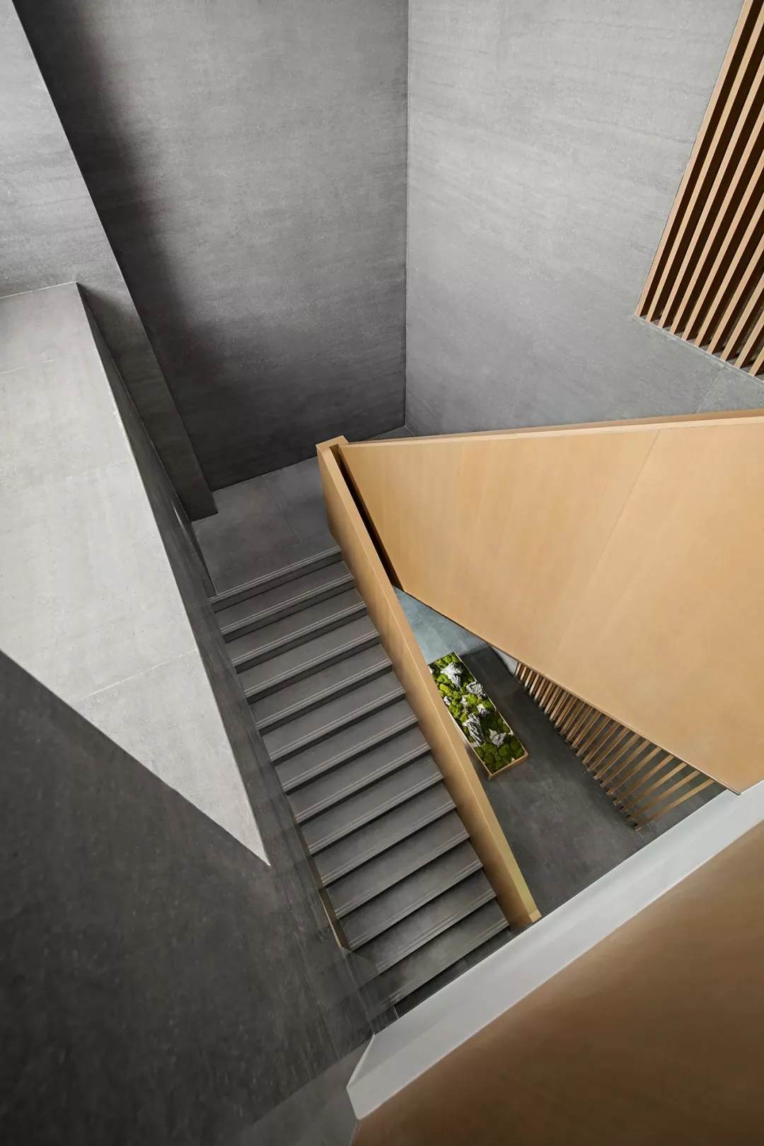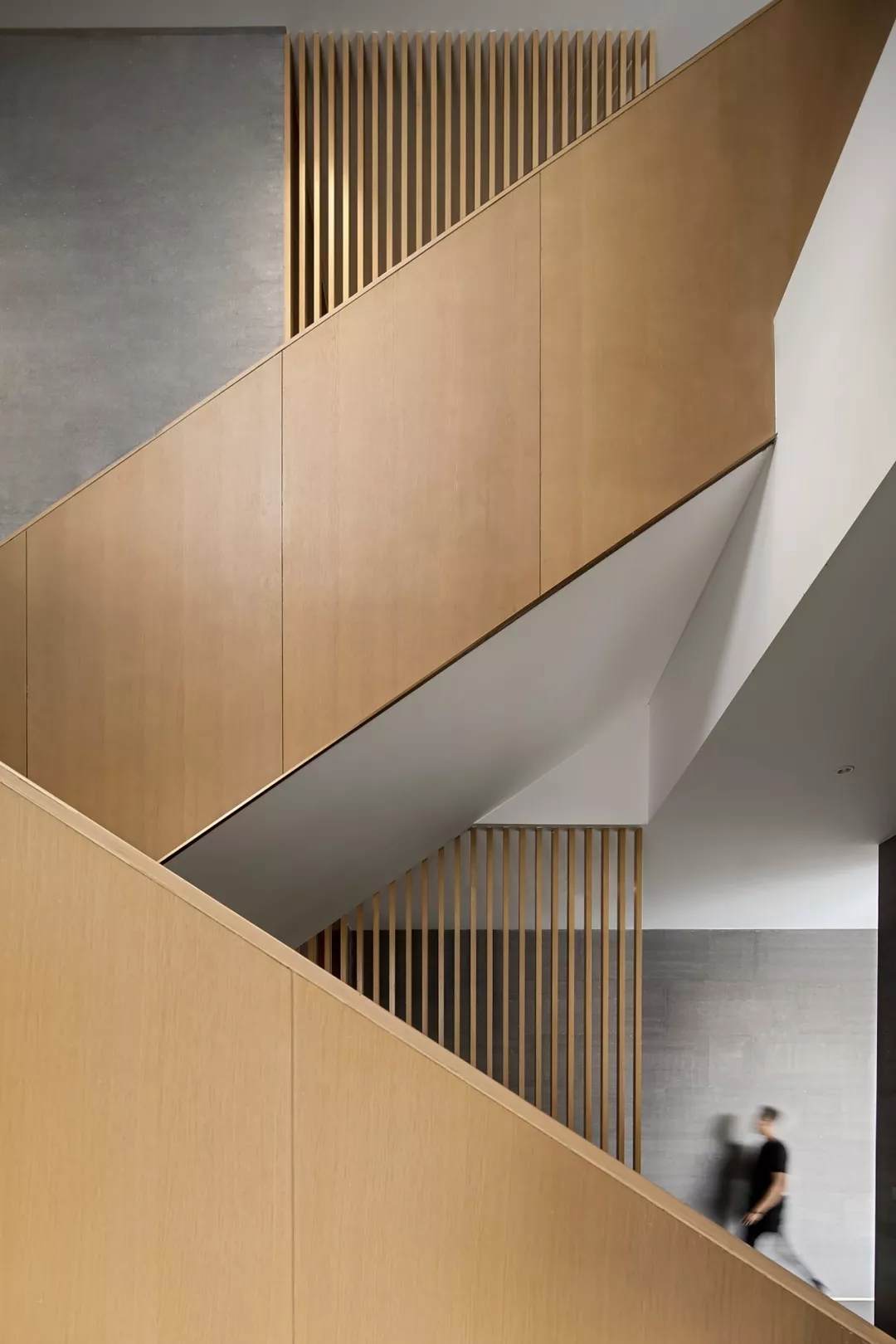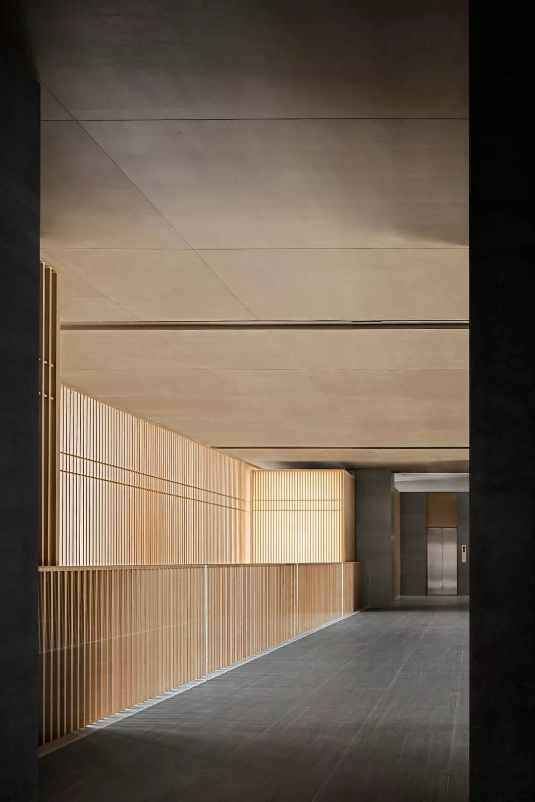 考慮到實用性與安全性,空中連廊處以玻璃扶手作為有力支撐,外圍予以木格柵裝飾,整體用色克制統(tǒng)一,在極具秩序感的光影里,彰顯了設(shè)計師一貫簡約純粹的風格。