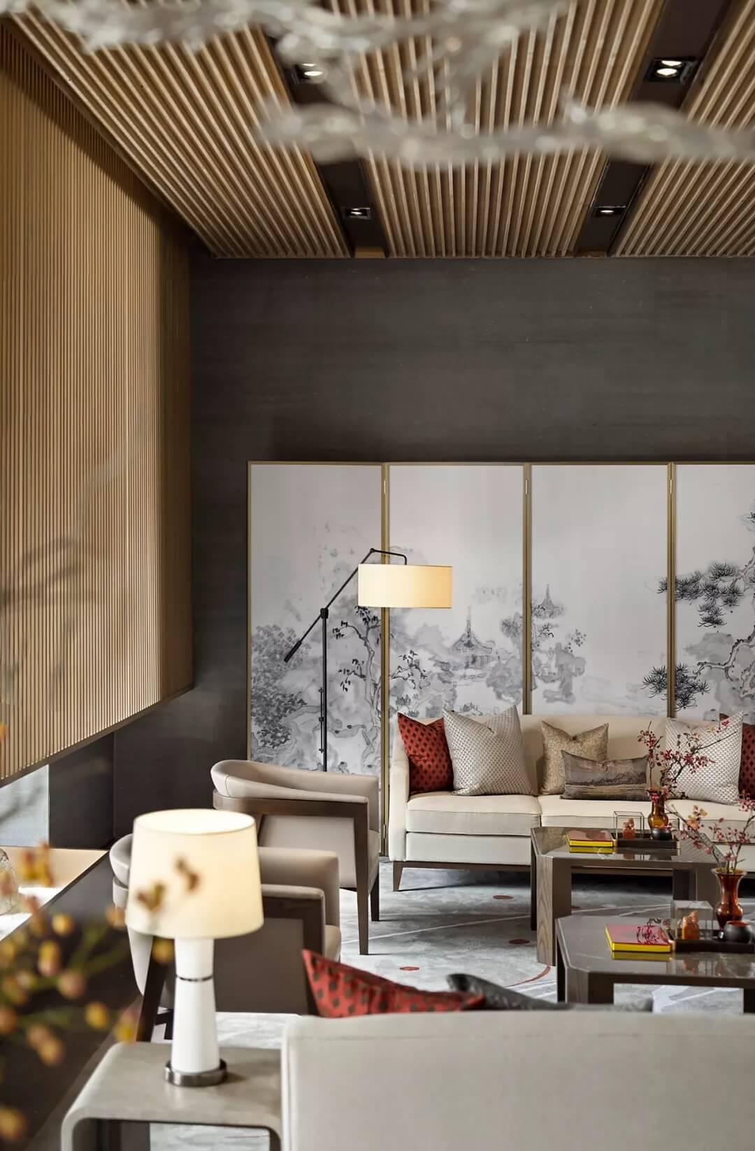 屏風上“高山流水遇知音”,宛如在娓娓道來伯牙子期當年的故事。收藏級裝幀叢書,代表禮儀身份的印章,抱枕上的祥云、山水刺繡,細致精巧的陳設(shè)烘托出文人雅趣,同時營造了沉穩(wěn)靜逸的氛圍,堅定地表達了現(xiàn)代東方的美學態(tài)度。