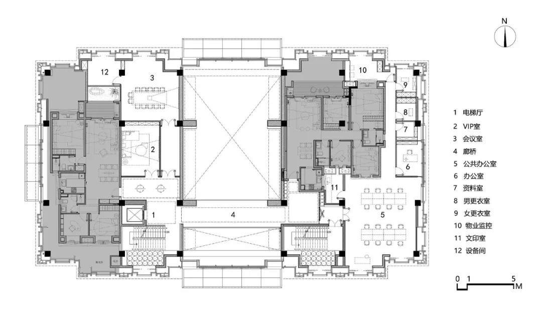內(nèi)部橫軸與縱軸兩條動線交叉,劃分出方正規(guī)整,卻又充滿開放互動式的功能分區(qū),這也是官宅建筑的題中之義??v軸動線上的兩側(cè)墻體向中心處略作延伸,上方木格柵內(nèi)包裹燈箱一體貫穿而成,下方則以金屬屏風陣列來開啟兩端分區(qū)的儀式感。在燈箱、屏風的逐層隱退與縮進中,打破了空間的單調(diào)與空曠,立面視覺更加莊重大氣。