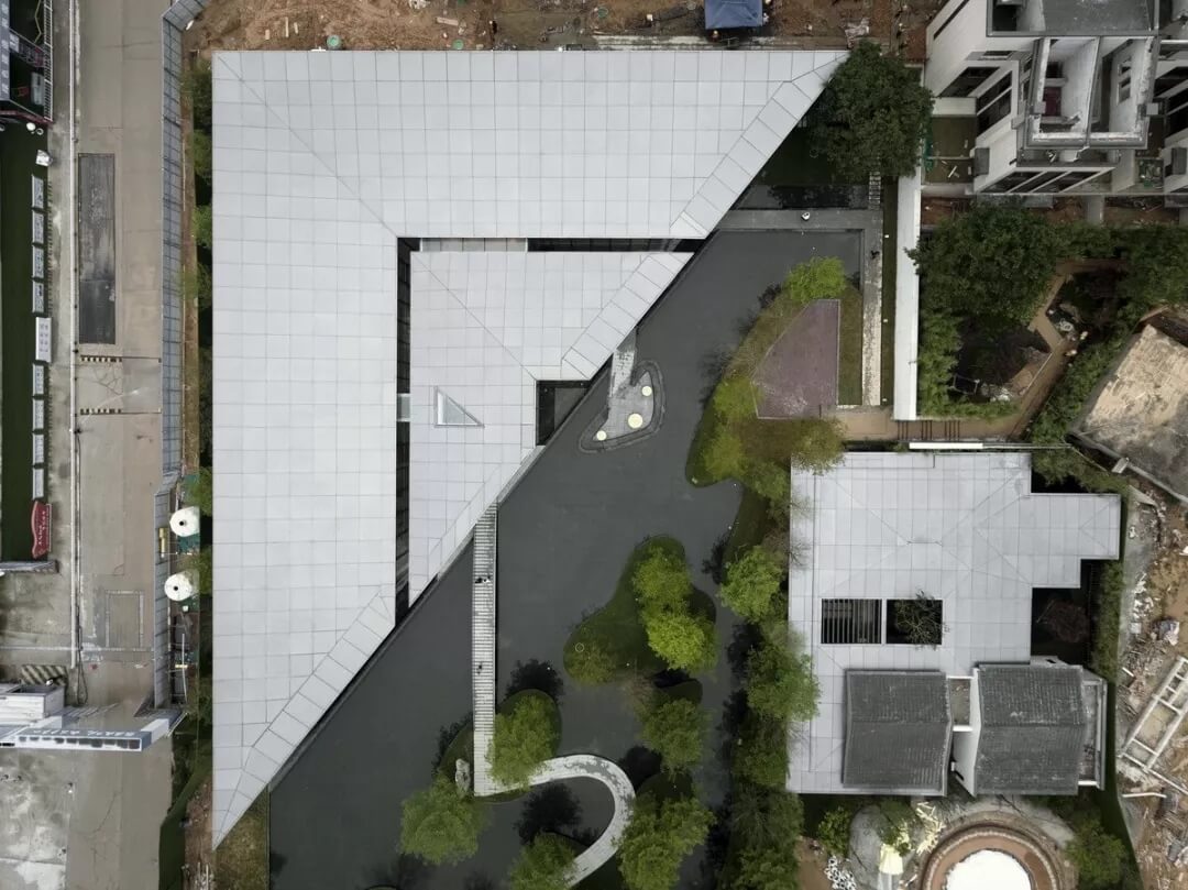 同時(shí),整個(gè)建筑運(yùn)用了現(xiàn)代構(gòu)圖的方式,突破了傳統(tǒng)對(duì)稱的客家建筑特征,將多個(gè)同心半圓演化成多個(gè)相似三角形,構(gòu)成了不對(duì)稱的幾何空間;巧妙地通過(guò)線與面的緩急對(duì)比加強(qiáng)了視覺上的層次感,以不同的設(shè)計(jì)手法,在保持建筑與外部交匯貫通的關(guān)系的同時(shí),強(qiáng)化了建筑的縱深感。