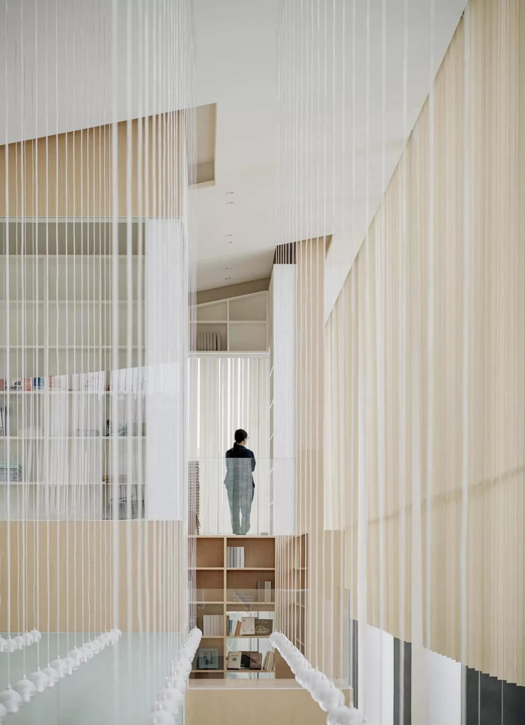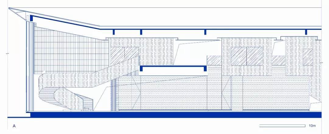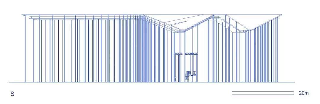 為了適應(yīng)當(dāng)?shù)貧夂颍ㄖ熢谀弦黼p層通高的開敞空間內(nèi)設(shè)置了懸垂的木隔柵,可以達(dá)到舒適的遮陽(yáng)效果,并且具有空間劃分的功能。公共洽談區(qū),雙層書架,咖啡吧就位于此。平行垂落且錯(cuò)落的木隔柵打破了安靜的空間氛圍,和室外的廊柱相互呼應(yīng)的同時(shí),密布的木隔柵也自身形成體量與二層的功能體塊虛實(shí)相生。
