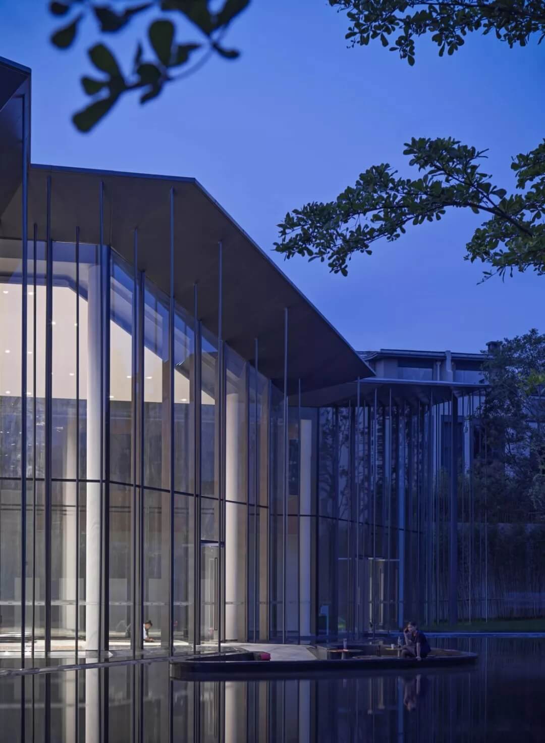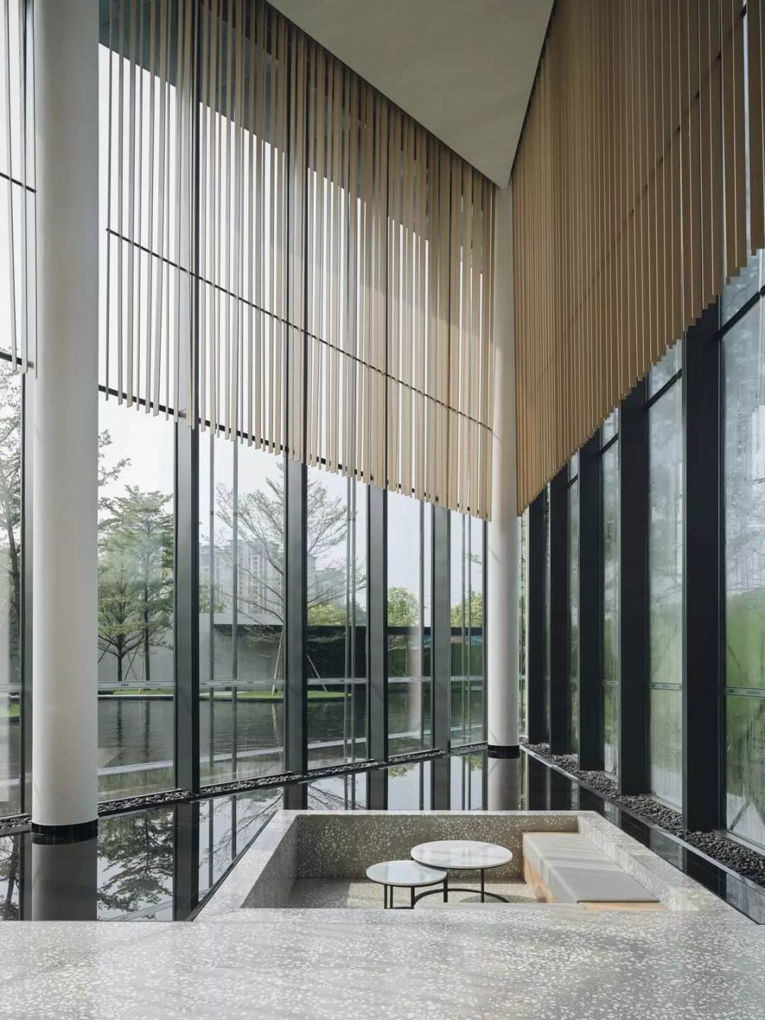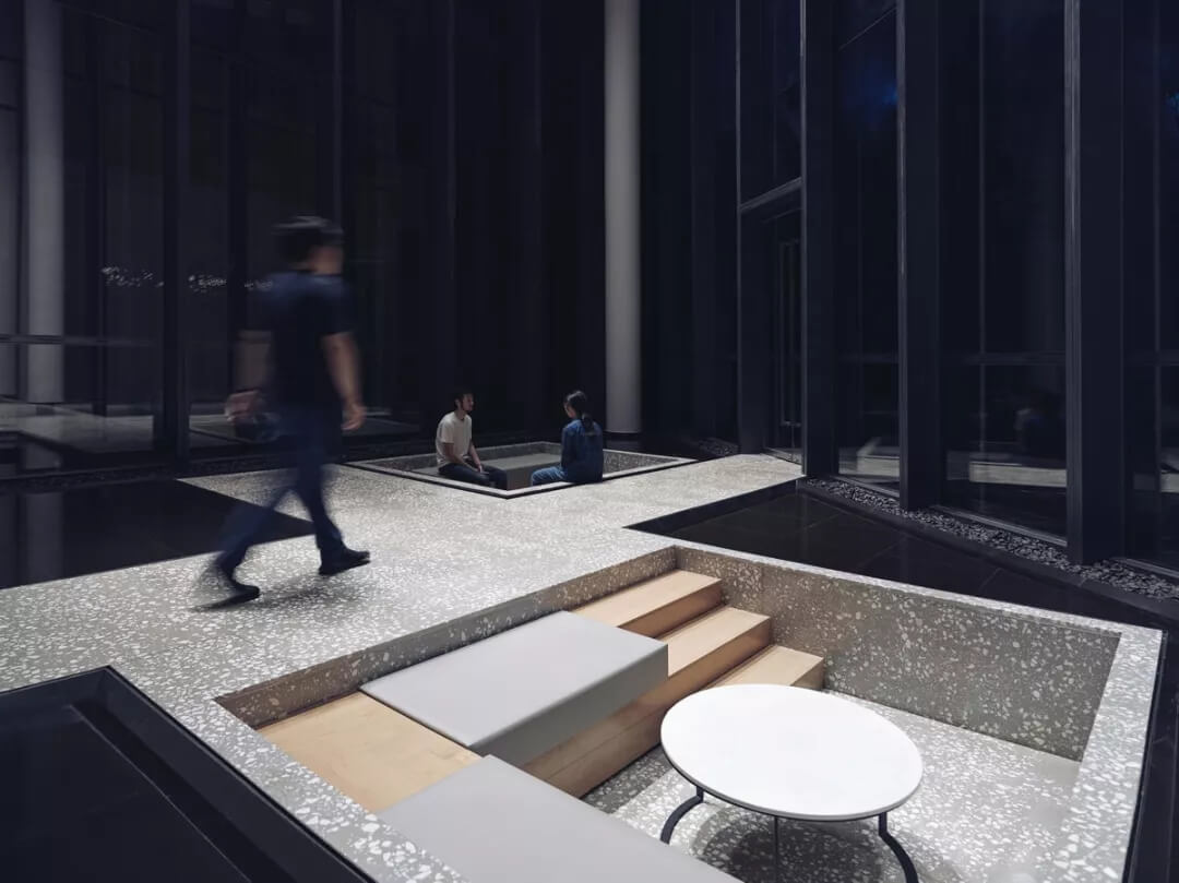 下沉式休息區(qū)由外部滲透進(jìn)來(lái)的水體環(huán)繞包圍,似客家建筑中的天井,收集儲(chǔ)蓄疏通雨水,淺水鏡面不僅倒映出光影的變化,也將窗外的枝繁葉茂引入室內(nèi),營(yíng)造出人與自然融于一體的環(huán)境。