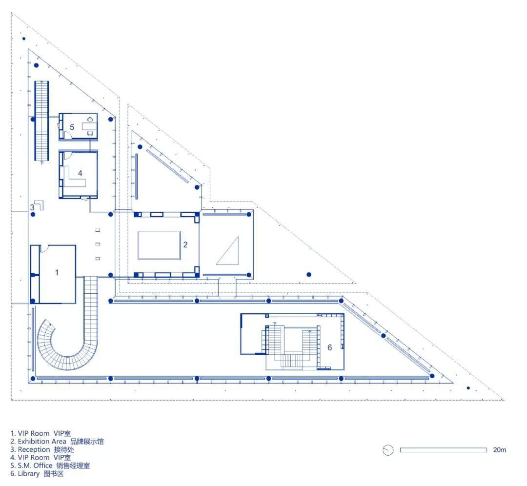 懸挑的頂棚引導(dǎo)游客進(jìn)入建筑內(nèi)部,映入眼簾的是錯(cuò)落分布著木質(zhì)懸浮盒子的雙層十米挑高空間。同時(shí)大面積的玻璃幕墻營(yíng)造的通透感,使得無(wú)論哪個(gè)方位,都具有內(nèi)外空間相通的視覺體驗(yàn)。隱藏在水池中的下沉休息區(qū),懸掛在天花上的木隔柵,穿插在旋轉(zhuǎn)樓梯和書架之間的休閑洽談區(qū),還有較為隱蔽私密的二層貴賓室,多個(gè)不同功能的空間仿佛彼此獨(dú)立,卻又渾然一體。