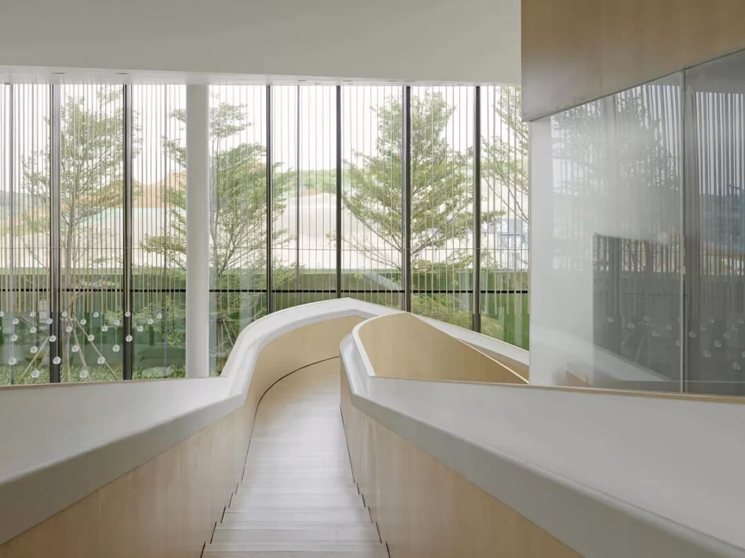 在直線構(gòu)成的空間中,設(shè)計(jì)師巧妙地設(shè)置了一個(gè)旋轉(zhuǎn)樓梯,經(jīng)過(guò)鋼結(jié)構(gòu)精確的計(jì)算,運(yùn)用了非柱支撐的結(jié)構(gòu)連接于兩層間。游客可以通過(guò)此旋轉(zhuǎn)樓梯到達(dá)二樓的貴賓室和辦公室,透過(guò)具有框景效果房間窗戶向外望出,看到室內(nèi)各部的同時(shí)亦可以觀賞周邊風(fēng)景。