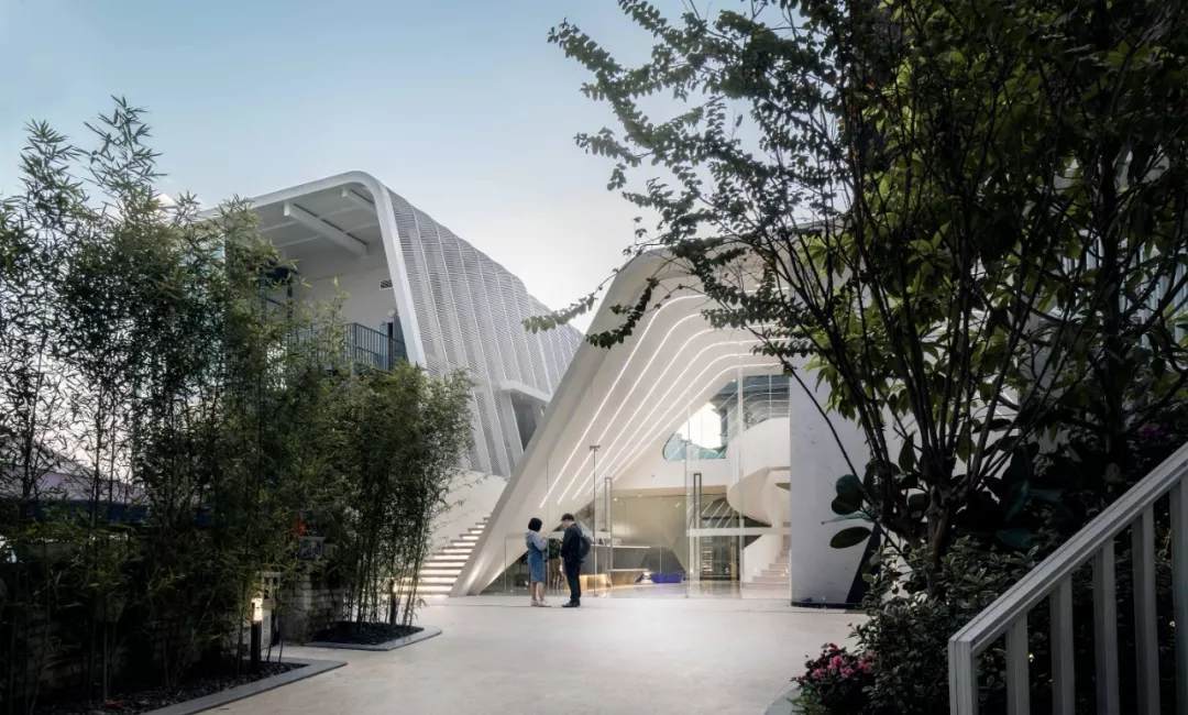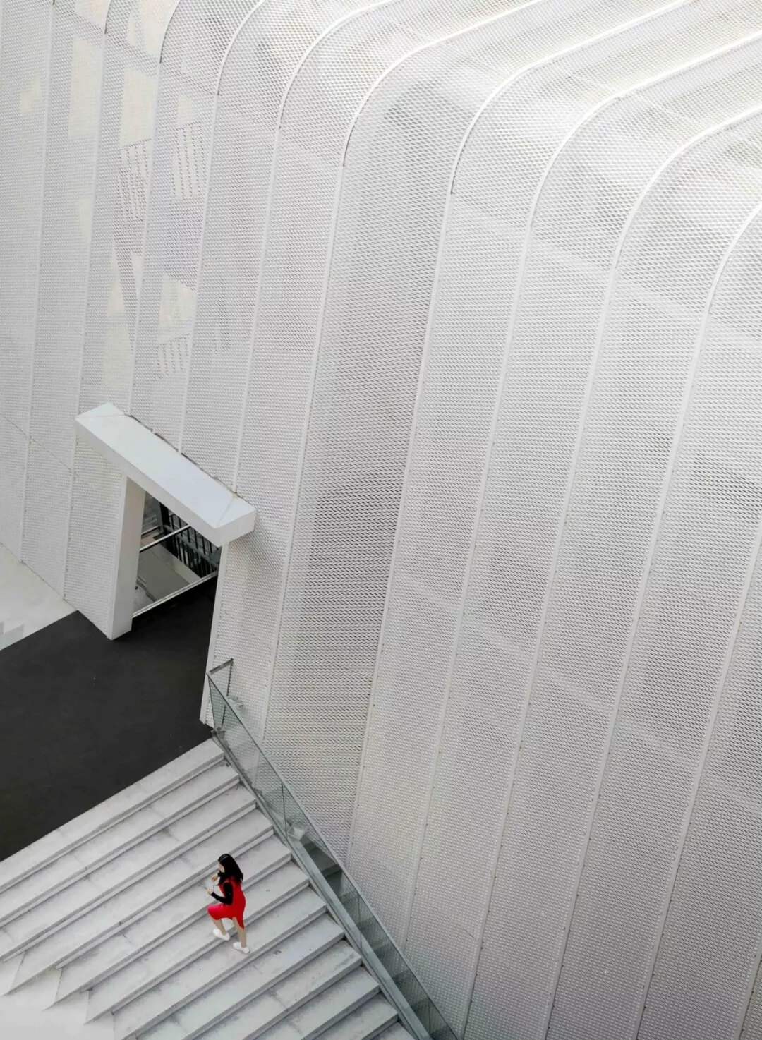 薄殼結(jié)構(gòu)與金屬幕墻構(gòu)成的“裙擺”創(chuàng)造出一層集合酒店接待、休憩與多功能廳的開放服務(wù)空間,漂浮為頂,下落為幕,抬升為廳,下沉為梯,旅客可以在裙擺之上游走,形成一條多變的觀景路徑,還原了山城的空間體驗。