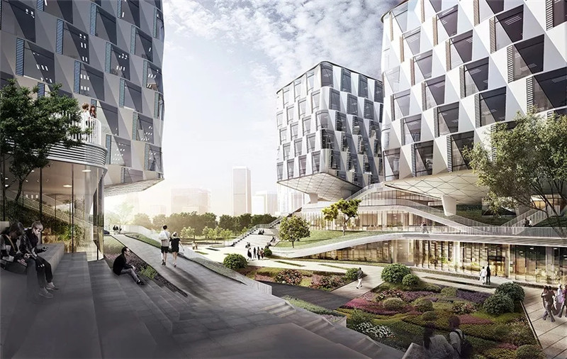 塔樓的形態(tài)力求簡(jiǎn)潔,形成三個(gè)體塊與裙房的對(duì)比關(guān)系,具有一定的標(biāo)識(shí)性。而在平面上稍作轉(zhuǎn)折變化,從視覺(jué)上消減建筑體量的壓迫感。每一幢塔樓都以左高右低的態(tài)勢(shì)首尾呼應(yīng),增強(qiáng)了建筑單體之間聯(lián)系,豐富了建筑天際線的變化。塔樓底部在裙房之上的局部起翹又為空間增加了多重的景深,在提供了多樣化的戶外活動(dòng)與景觀空間的同時(shí),也在視覺(jué)效果上營(yíng)造了一種即將破浪躍起的動(dòng)感,呈現(xiàn)活躍而又靈動(dòng)的生命力。