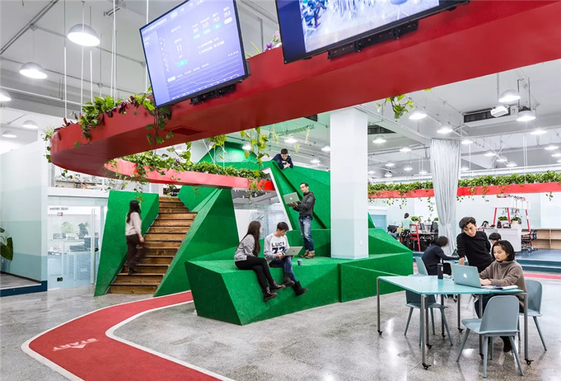 5個(gè)公司由一個(gè)中間懸掛的“紅環(huán)”聯(lián)系在一起,紅環(huán)上種植蔬菜與植物,下面對應(yīng)的是跑道。員工在跑道健步的同時(shí)可以打電話,也可以與照料植物的同事進(jìn)行交談。