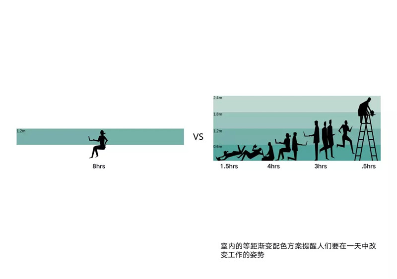 室內(nèi)的顏色旨在提醒人們時(shí)刻保持活動(dòng),變換工作的姿勢。覆蓋墻身和立柱的藍(lán)色以60厘米為間隔漸變,每個(gè)顏色對應(yīng)不同的姿勢和活動(dòng),如躺、坐、行走和攀爬。