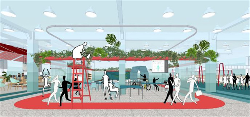 “凹凸桌”這個(gè)模塊化的家具可單獨(dú)使用,也可組合成各種不同狀態(tài)。因?yàn)樗?,使?ldquo;紅環(huán)”內(nèi)的空間可作為臨時(shí)大型活動(dòng)空間,也可成為孵化社會(huì)企業(yè)的靈活空間。“眾行頂”可在空間內(nèi)靈活移動(dòng)與展開,結(jié)合“凹凸桌”,隨時(shí)構(gòu)建出獨(dú)立的會(huì)議空間。