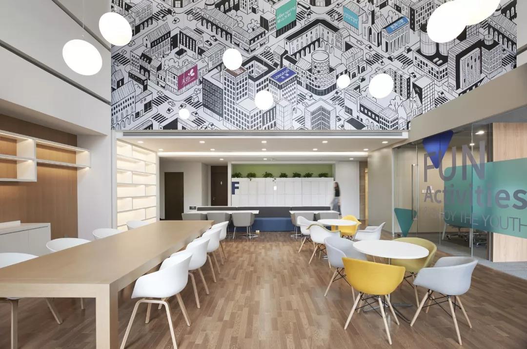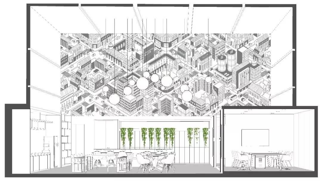 南側(cè)挑高區(qū)的空間定義為“城市客廳”,視覺感受區(qū)別于北區(qū)的咖啡主題,更加明快現(xiàn)代,為整個辦公區(qū)帶來時尚、活躍、靈動的感受。“活力城市”的軸側(cè)插畫裝點(diǎn)了整個挑高區(qū)二層墻面,龍湖重點(diǎn)產(chǎn)品的標(biāo)識隱含其中,傳達(dá)出龍湖精彩紛呈的產(chǎn)品類型和高品質(zhì)特征。