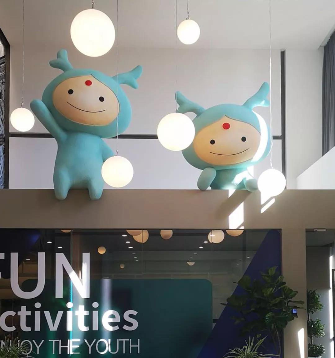 此區(qū)域另外的一個亮點(diǎn)是在會議室頂端利用空間設(shè)置了“龍小湖”巨型卡通造型,同此空間的人招手互動,為空間帶來了一種親和的童趣。也是傳達(dá)龍湖企業(yè)形象的一處絕佳空間。