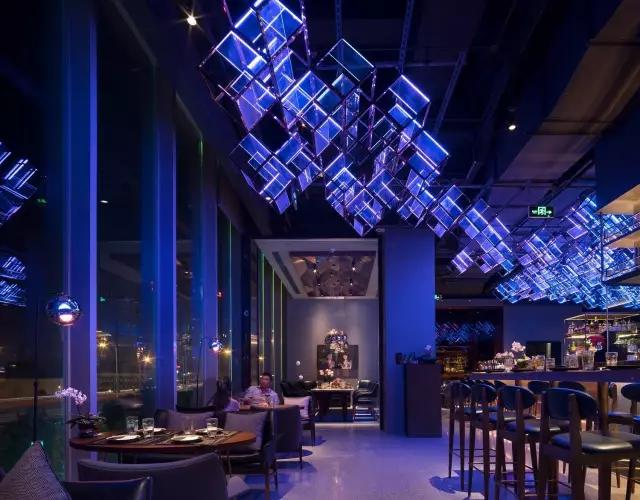 attabj意大利餐廳最美之處便是天頂上的藝術(shù)燈群,設(shè)計(jì)師通過抽象化、藝術(shù)化的手法,將這一感官體驗(yàn)濃縮為空間當(dāng)中的一組裝置,透明亞克力單元體如同酒杯內(nèi)的冰塊,而不斷變幻的LED燈光就像是色彩斑斕的酒體,兩者相互反應(yīng)形成夢(mèng)幻迷離的光影效果。